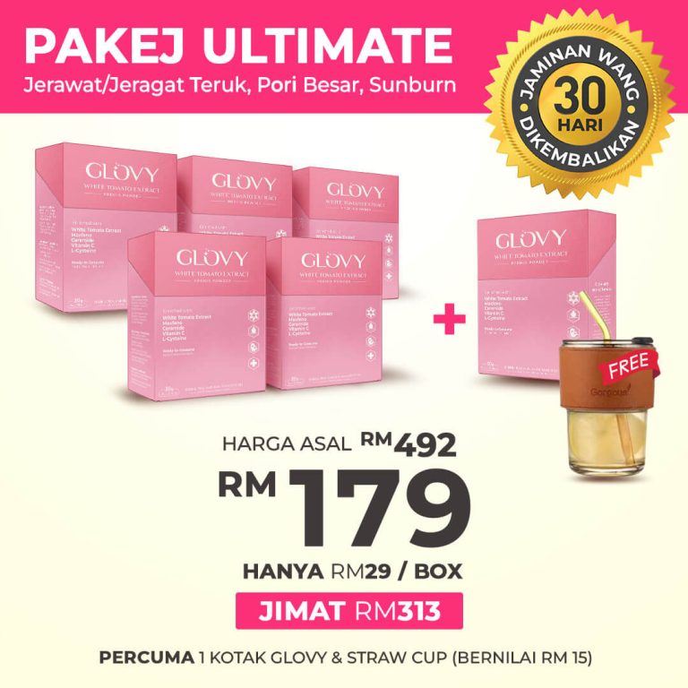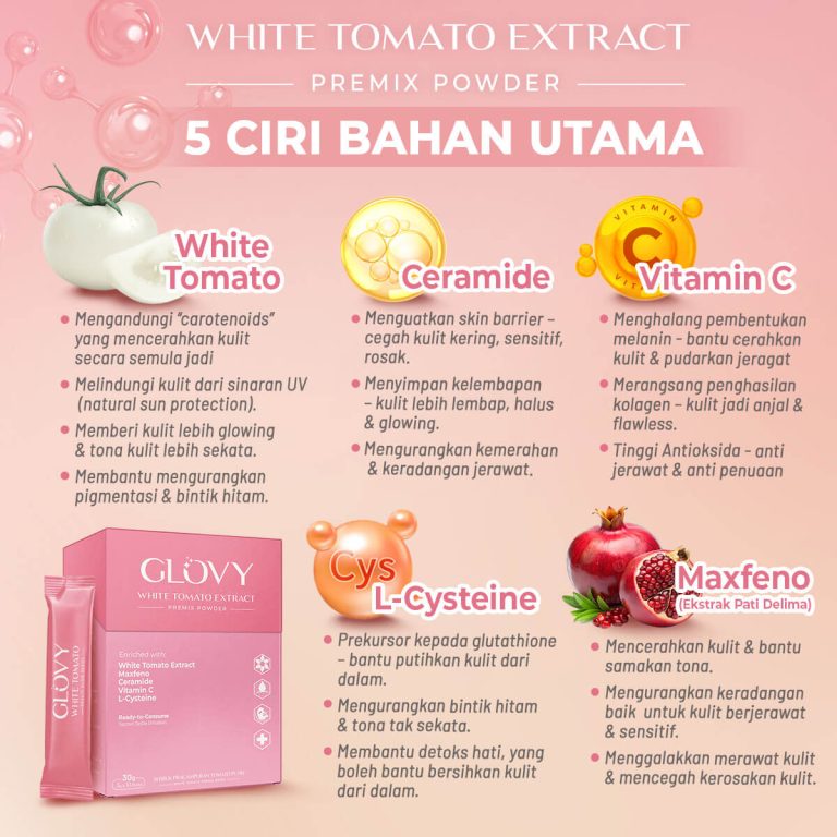 100% formulasi GLOVY bebas bahan merbahaya, Tiada gula tambahan dan Tiada Maltodextrin. GLOVY hanya guna bahan aktif premium seperti White Tomato, Ceramide, Maxfeno, L-Cysteine & Vitamin C